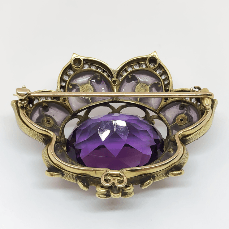 Regular price $12,500.00 Save $-12,500.00Authentic antique large oval Amethyst brooch with diamond and pearls. The genuine fine quality faceted oval amethyst measures 23mm x 18mm weighing approximately 20 carats. The diamonds are set in platinum, old European cut shape with a total weight of 1.00 carats. The pearls measure 4mm - 5.5mm. This special piece is circa 1900. Pale transparent lavender Plique-à-jour enamel in open areas. The brooch measures 2 inches x 1 3/4 inches with a long horizontal pin closure on the back. Stamped "Marcus & Co 18K".