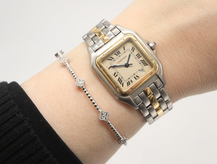 Regular price $5,300.00 Save $-5,300.00Pre-Owned 1990s Cartier Panthere Medium, watch in stainless steel and 18K gold with a aged white dial. Case measures 27mm, Cartier quartz movement and a date window. Steel and gold link bracelet with a butterfly style clasp, bracelet measures 8" in length. Watch comes with a one year store warranty.